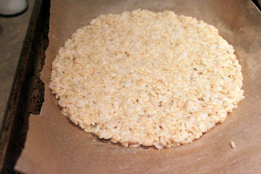 On a parchment lined sheet, Drop the dollop of sticky brown rice and press the brown rice into a round 9 to 10 inch crust shape. Press the edges well.