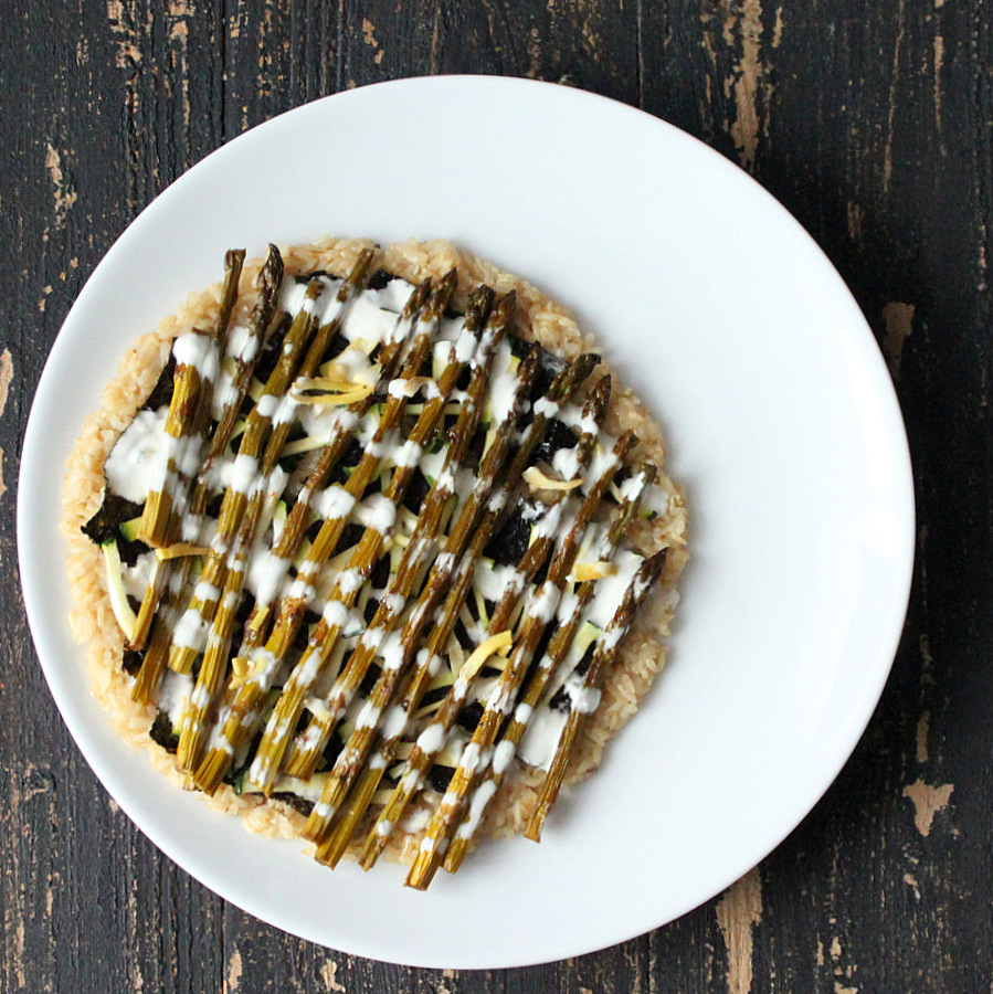 Sushi Pizza – Spiced Brown Rice Crust with Nori, braised Asparagus, Zucchini and Wasabi Mayonnaise